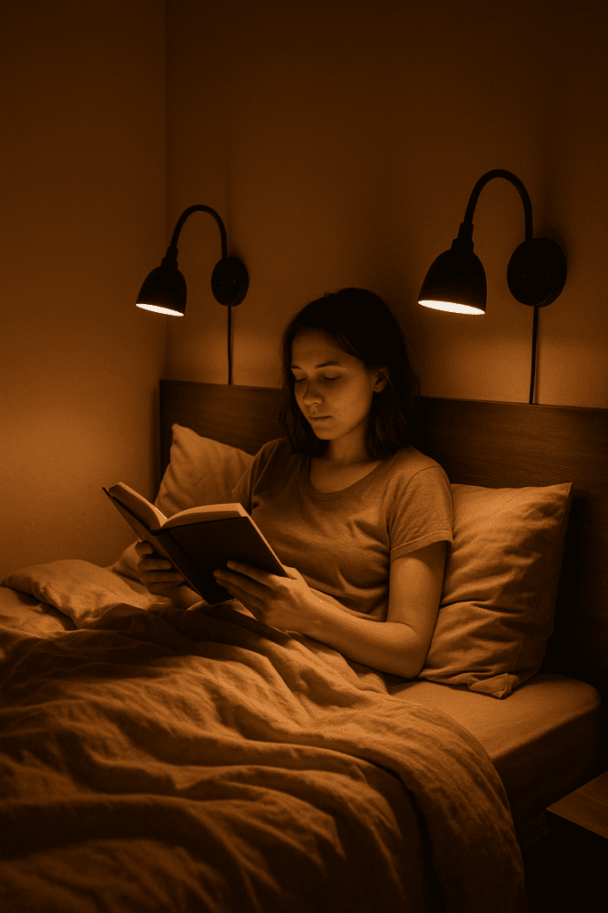 نور وظیفه‌ای (Task Light) مثل آباژور کنار تخت یا چراغ دیواری با نور طبیعی (حدود ۴۰۰۰ کلوین) برای مطالعه بهترین گزینه است.