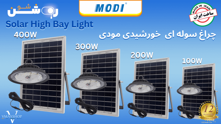 چراغ آویز خورشیدی SMD مودی که با نام چراغ سولهای سولار (Solar High Bay Light) نیز شناخته میشود، یکی از محصولات پرفروش و کاربردی برند مودی است. این چراغها در مدلهای IR-MD74100، IR-MD74200، IR-MD74300 و IR-MD74400 عرضه میشوند و توان مصرفی آنها بهترتیب ۱۰۰ وات، ۲۰۰ وات، ۳۰۰ وات و ۴۰۰ وات است.